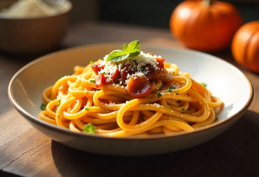 Pumpkin isn’t just for pies or soups it’s incredibly versatile and adds a rich, comforting texture to pasta dishes. When pureed, pumpkin becomes silky smooth, and when combined with goat cheese, it forms a creamy sauce that envelops the pasta in deliciousness. Plus, pumpkin is naturally sweet, so it brings a subtle sweetness to the dish that balances out the saltiness of the bacon and the tang of the goat cheese.